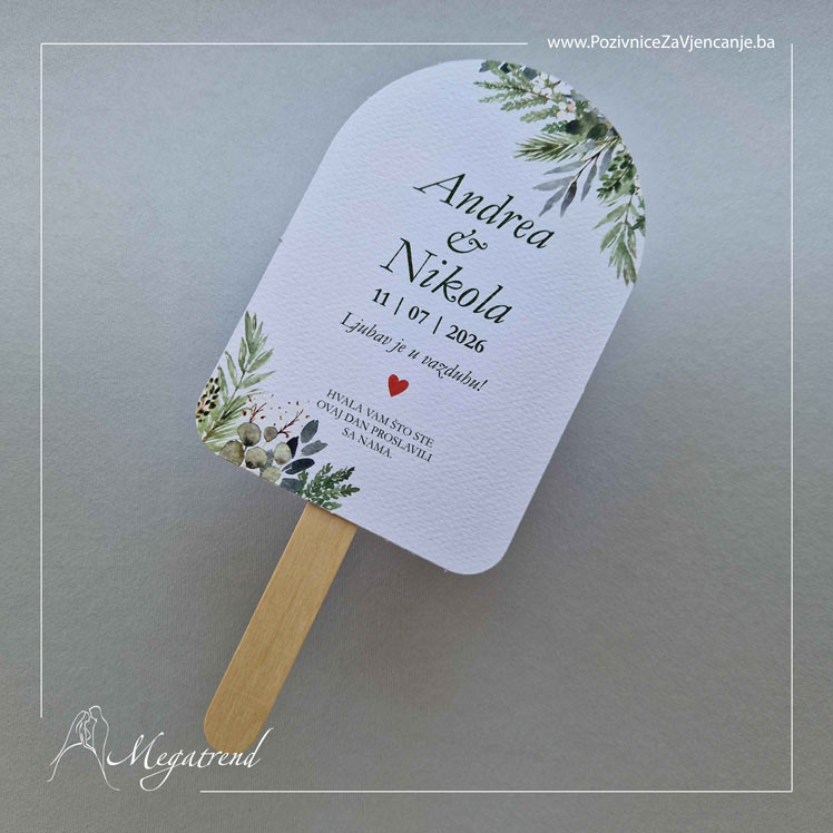 Prednja strana lepeze je personalizirana – može sadržavati imena mladenaca, datum vjenčanja i posebnu poruku ili motiv prema vašoj želji, što ovaj proizvod čini i funkcionalnim poklonom i nezaboravnom uspomenom za vaše goste.