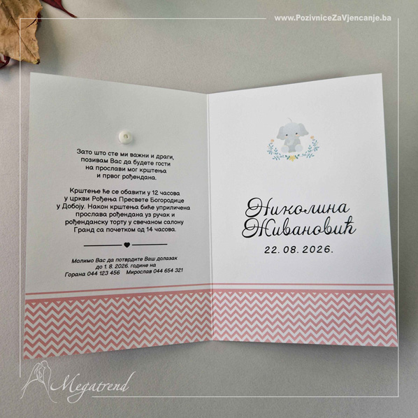 Ovaj model pozivnice se sastoji od glavnog komada papira na kojem se štampa tekst, pratećeg papirnog ukrasa i plastične nitne.